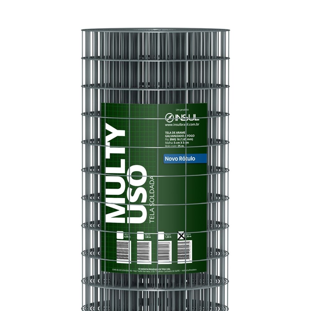 Produzida com arame fio (1,90 mm) galvanizado a fogo, possui malha de 5x5 cm, rolos medindo 25 metros de comprimento e está disponível nas alturas de / 1,02 / 1,22 / 1,52 m.